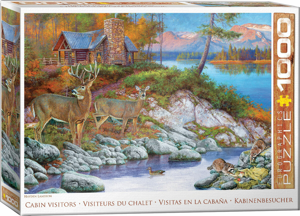 Eurographics Cabin Visitors 1000-Piece Puzzle. Finished puzzle size: 19.25" x 26.5". Artist Hayden Lambson paints a rustic setting with a cozy mountain cabin on the water. Two deer look around cautiously before taking a drink. Strong high-quality puzzle pieces. Puzzle made from premium European recycled blue board paper and printed with vegetable based ink. Age graded 13+ years of age.