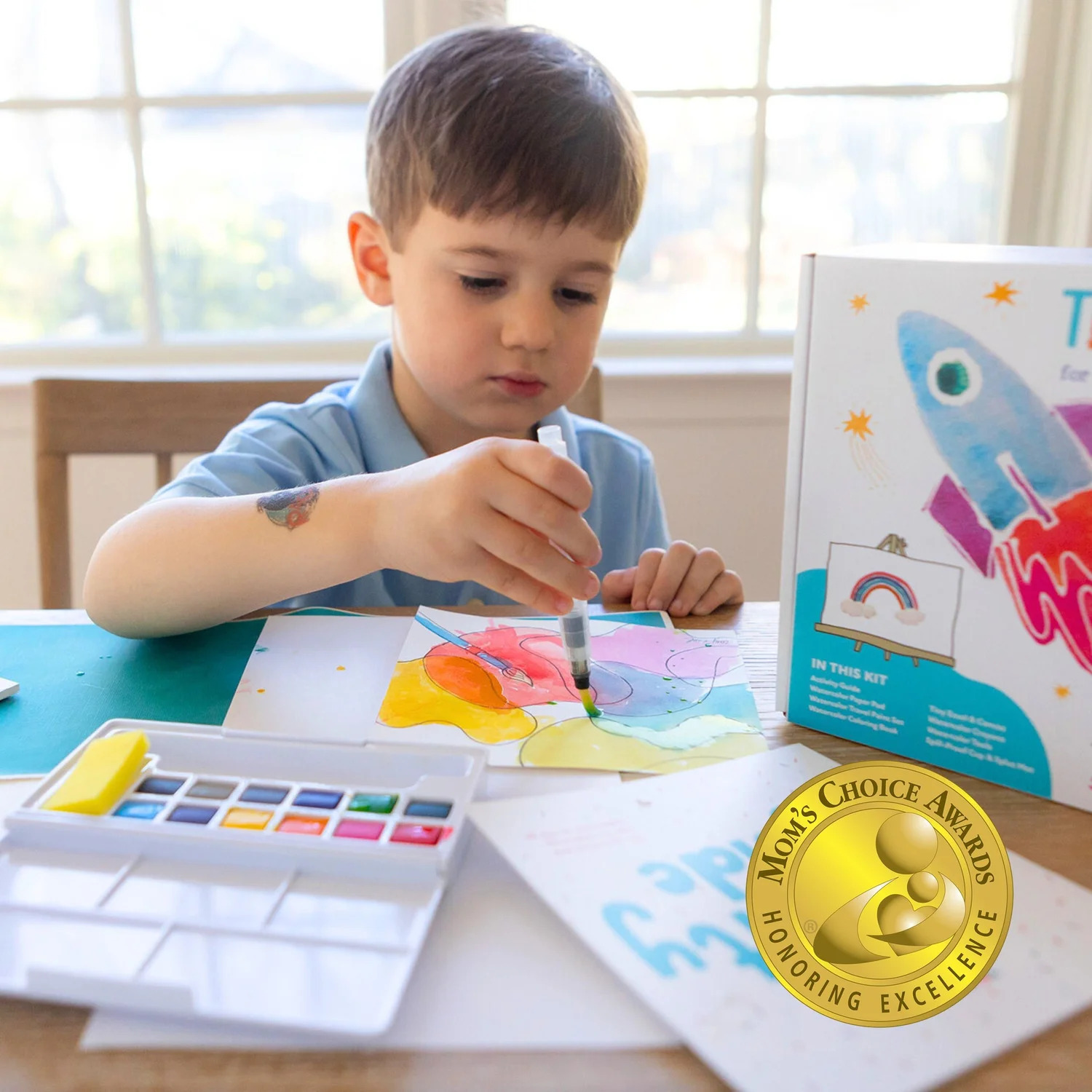 The Tiny Easel Traveler kit is perfect for traveling and adventures on-the-go. Just bring your Watercolor Book and Watercolor Crayons to the restaurant and come back home to add water to bring it to life. Take the whole kit on vacation and let your kids paint on the beach. Fill the water brush wand with water and your tiny artist is ready to create outside or on-the-go!