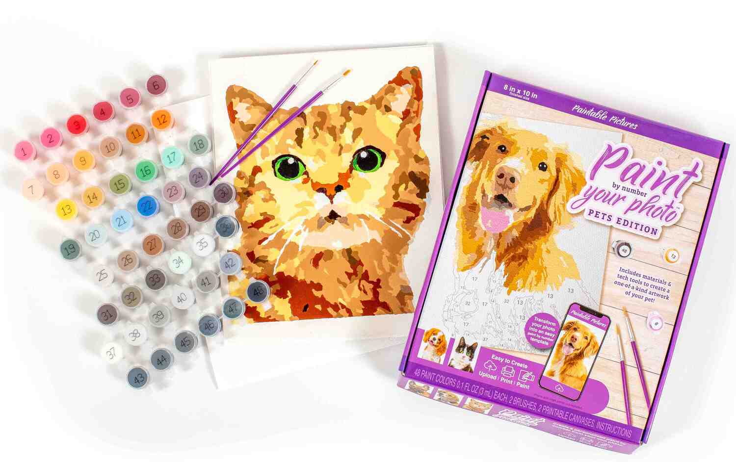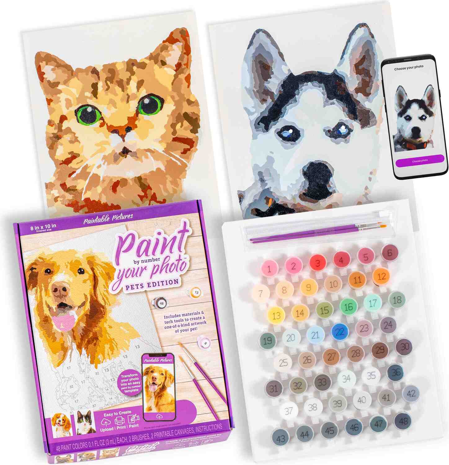 - Everything You Need in One Box: No need to upload photos at the time of purchase or make additional purchases— blank canvas, 48 specialty pet colors, brushes, and tech tools included. Makes one 8" x 10" painting.