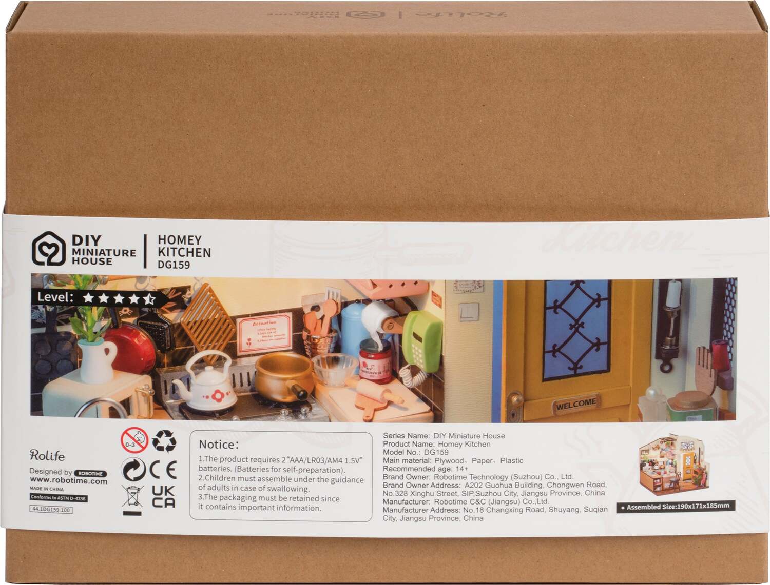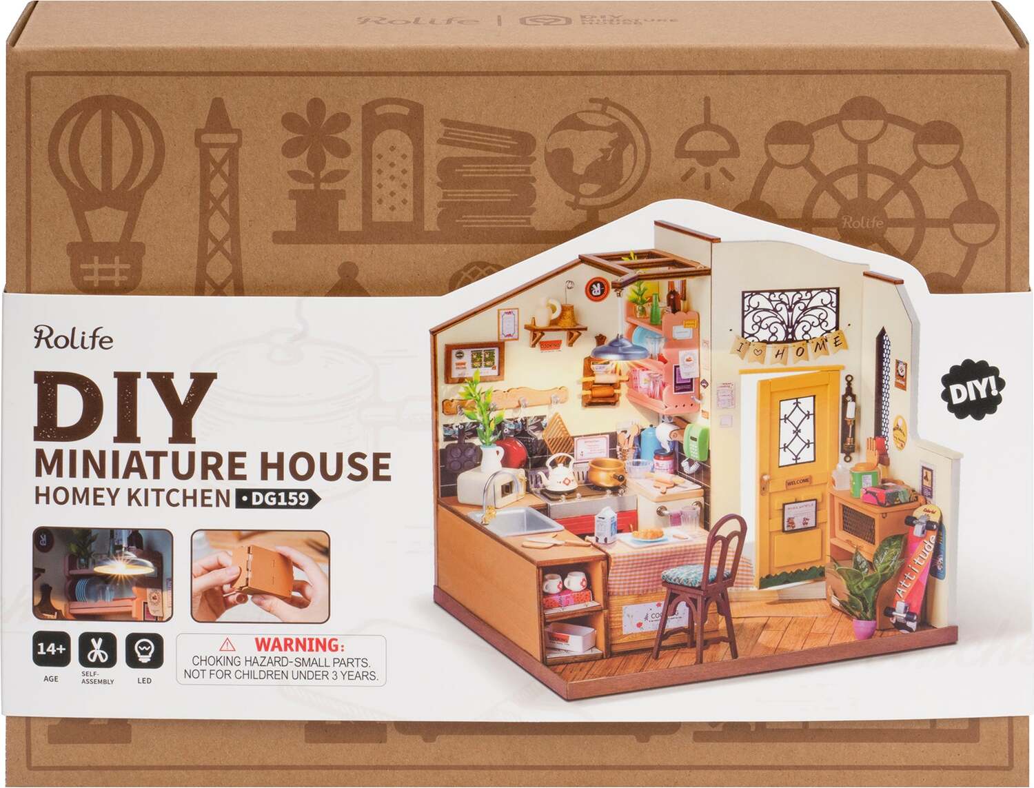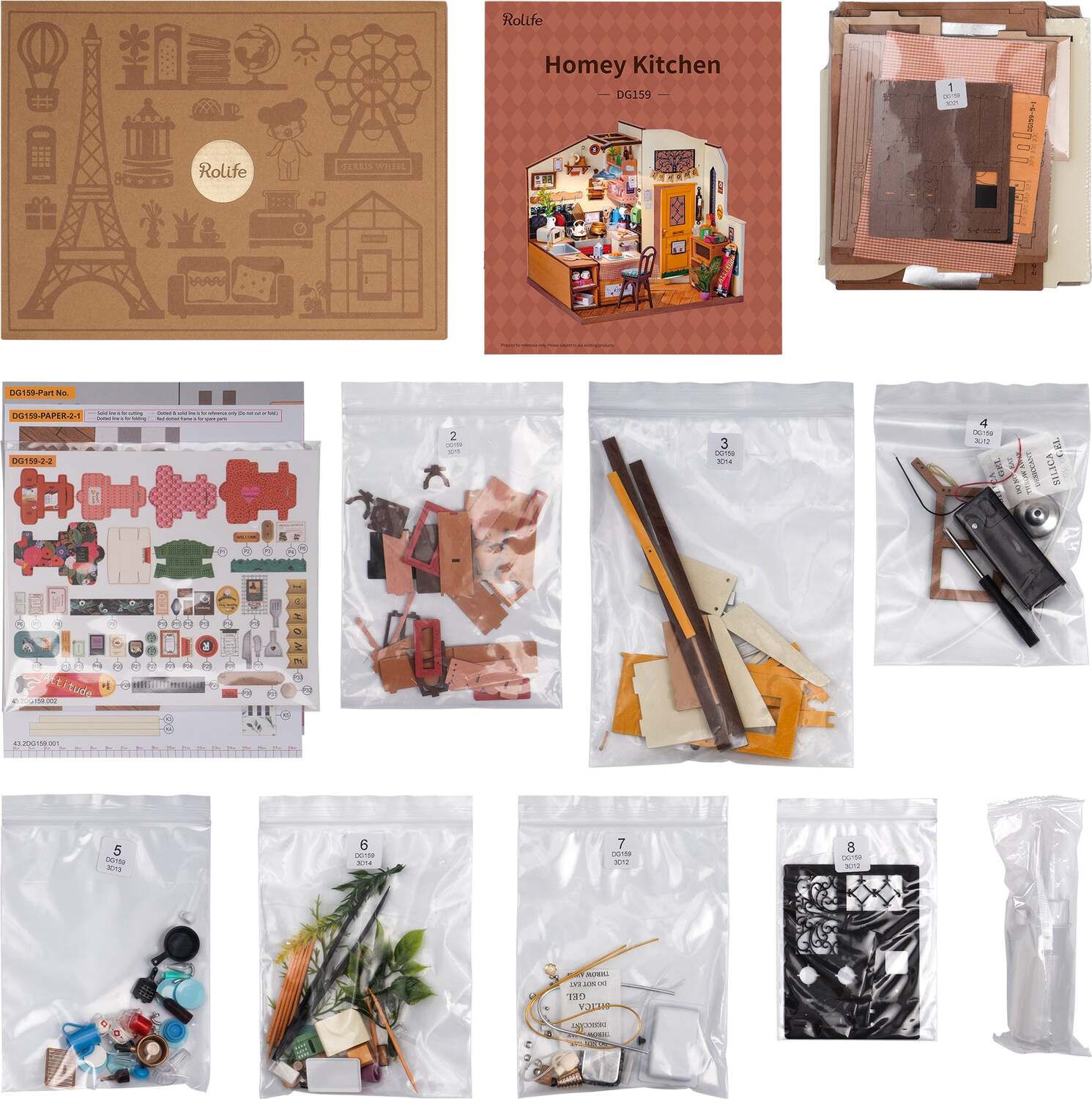Homey Kitchen is perfect for you whether you're a veteran miniaturist or a beginner! This little library will keep you busy as you design and create your perfect little space. Kids and adults alike can enjoy our miniatures. There are light fixtures with tiny LED bulbs to light up each to make it realistic. The bright and warm lighting will add a nice, finishing touch to your room, table, or shelf. This kit includes an instruction book with illustrations to give you an idea of its potential and help your dreams come alive.