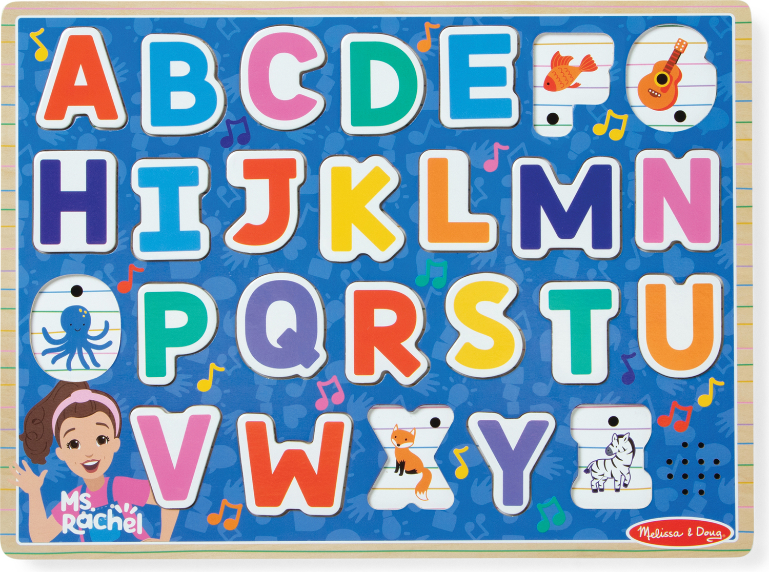 Kids will love hearing and learning to say the alphabet with their favorite educator, Ms. Rachel! The 26-piece Melissa & Doug® Ms. Rachel™ Wooden Phonics Alphabet Sound Puzzle includes favorites from Ms. Rachel's popular baby and toddler videos. Lift the pieces to hear Ms. Rachel pronounce letter sounds and words that begin with each. An on/off switch allows for quiet play (2 AAA batteries required, not included; sounds are light-activated - for best results, use in bright, direct light). Pictures under pieces help with matching and boost self-esteem. Encourage language, memory, spatial awareness, problem-solving skills and more with this Melissa & Doug puzzle and Melissa & Doug toys. These Melissa and Doug toys are toddler learning toys, designed by Ms. Rachel and developmental experts, to support all children, through their ages and stages, from 2-5+ years. Ms. Rachel toys are ideal newborn toys, toddler toys, preschool toys, and wooden toys. From baby shower gifts to baby essentials, these products help babies and families learn, bond, and thrive. Ms. Rachel is a real teacher and passionate educator, with two master's degrees in education, who creates research-based videos and products to support learning for littles.