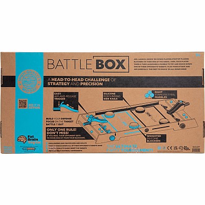 Battle Box Wooden game of launching marbles to knock down targets Encourages spatial reasoning, hand-eye coordination, strategy skills Take turns placing blockers, then take turns launching the marbles Every time you miss, your opponent gets to move one of your blockers First to knock down all of their opponent's targets wins. Turn the dials to easily reset the targets and play again!
