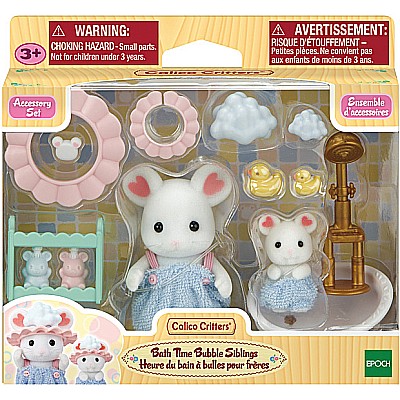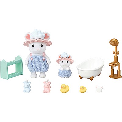 Imaginations bloom in the whimsical world of Calico Critters with this ready-to-play set. Little learners enjoy hours of storytelling adventures as they role play tub time with Marshmallow Mouse and his baby sibling. The details are so sweet: matching outfits, shower caps that soapsuds can sit on, bath toys and a rack to store them on, and soap bottles shaped like mice! This set is perfect for imaginative play and makes a delightful addition to any Calico Critters collection!