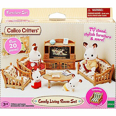 Comfy Living Room Set features picture sheets within the television that can be taken out and replaced to change the television picture. The included interchangeable materials for the sofa and armchair allow for easy design changes.