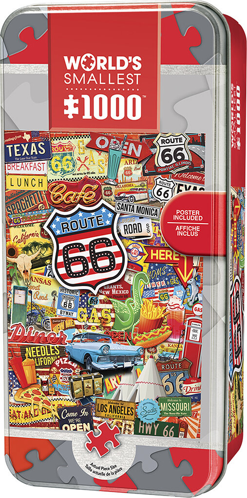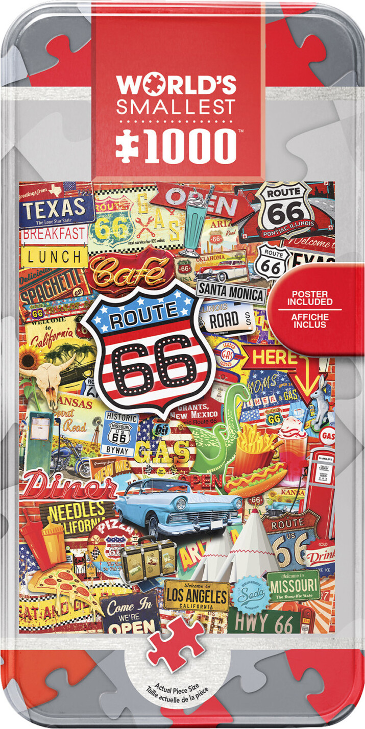This MasterPieces 11.25" x 16.75" World's Smallest 1000pc Puzzle is designed for both entertainment and ergonomics. Sold in a compact 4" x 8" collectible tin box, this puzzle will fit anywhere! It features a collage of images about the famous Route 66. To reduce its impact on Masterpieces environment, the chipboard used in this puzzle is made of recycled material.