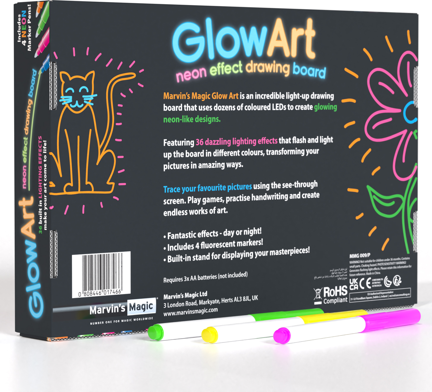 This black version of Marvin’s Magic Glow Art is a unique craft kit for creating mesmerizing magic masterpieces without any mess! Simply trace your picture onto the magic drawing board using our special pens and watch them come to life!