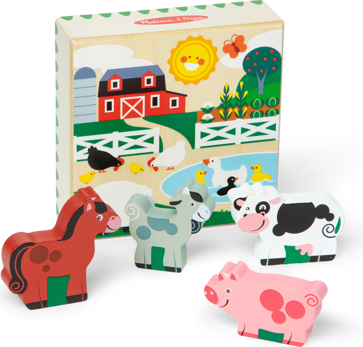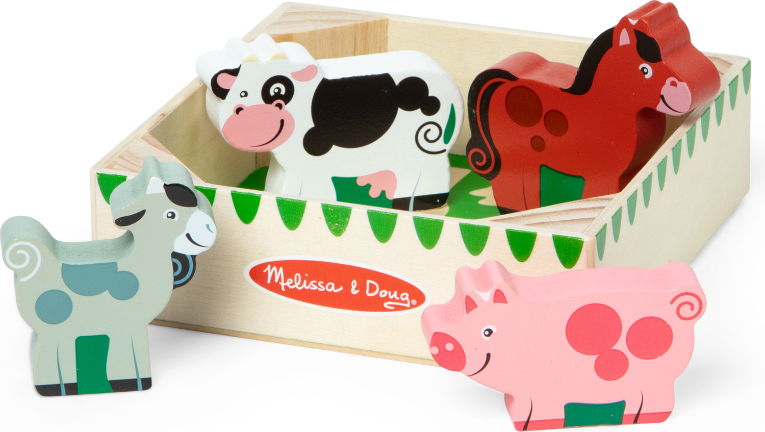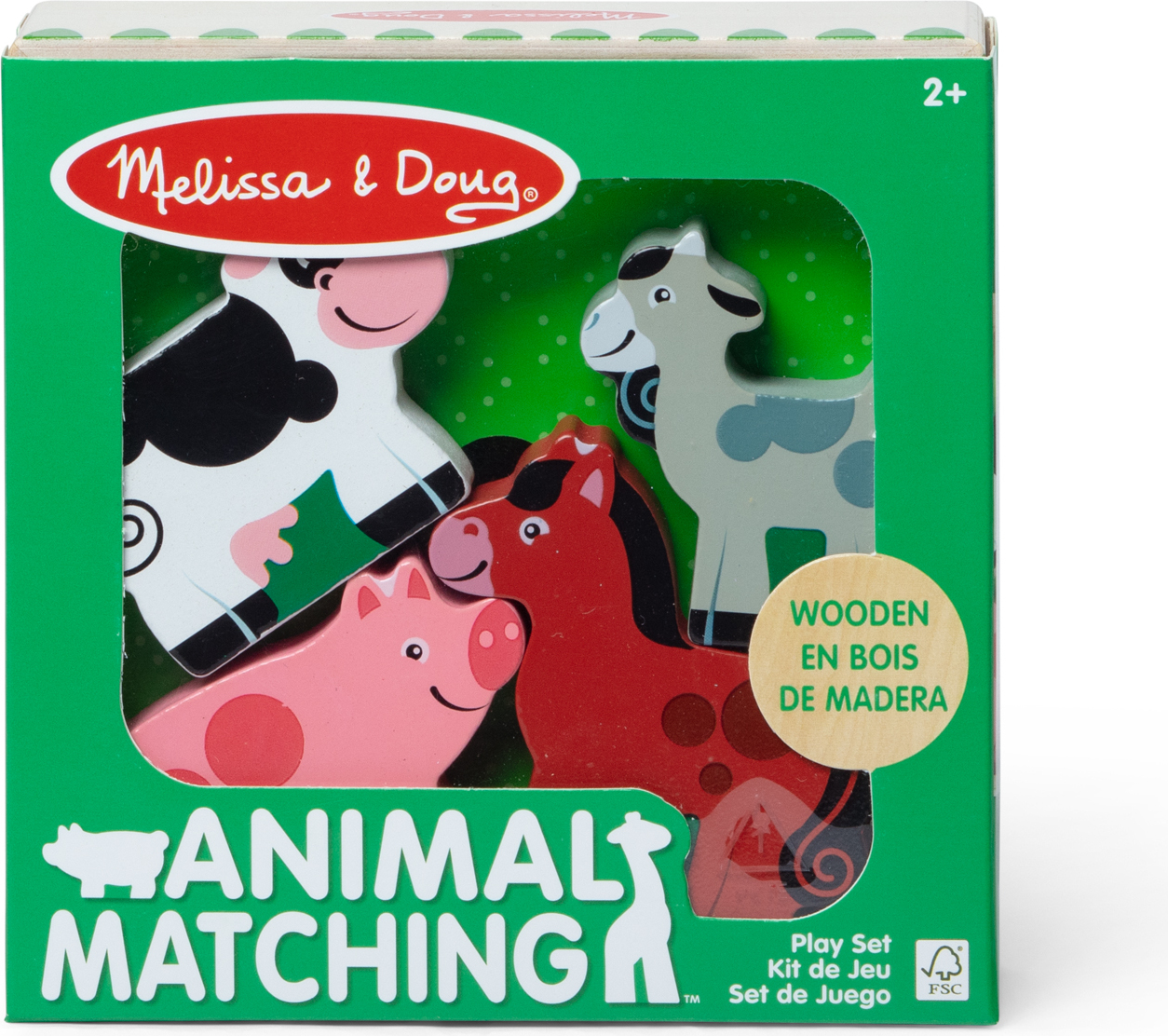 - Melissa & Doug Animal Matching Play Set includes 4 play figures: cow, pig, horse, and goat, and a wooden tray for matching, storage, and for use as a background scene for pretend play