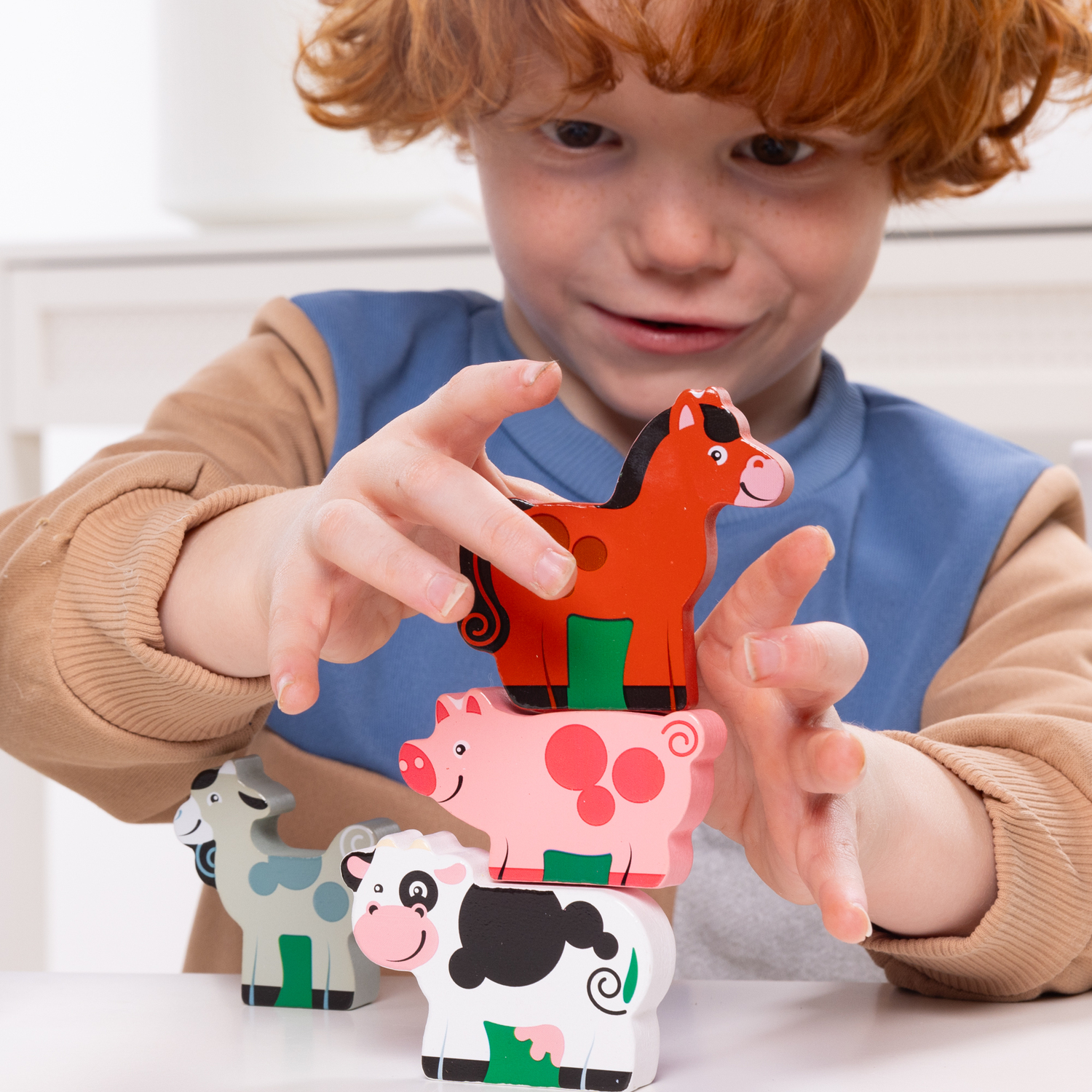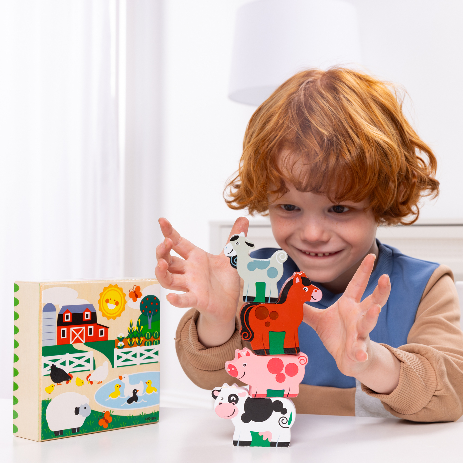 Features- Match double-sided wooden chunky play pieces to outlines in a sturdy wooden tray, stack them into a fun barnyard animal tower, or act out stories down on the farm