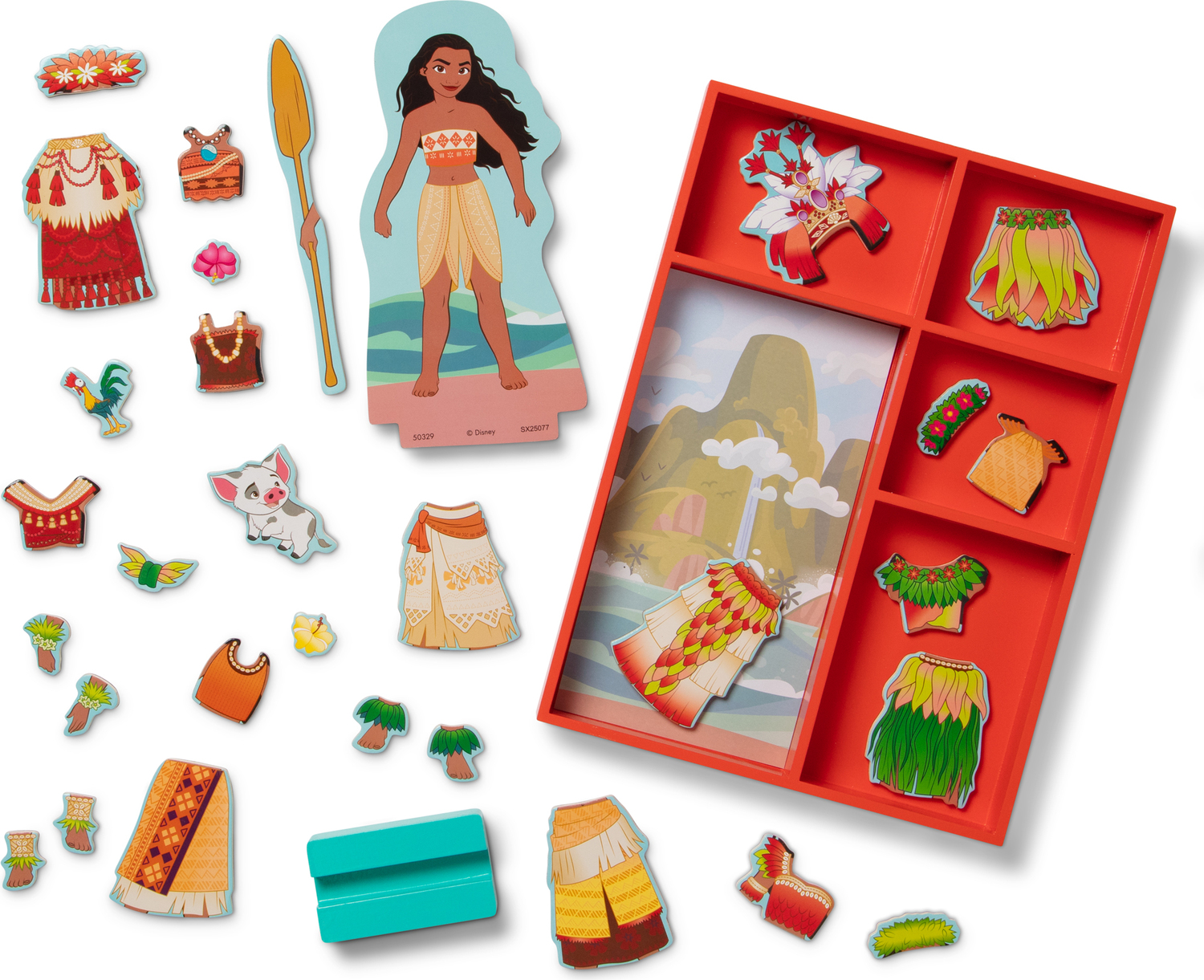 Features- Dress the Melissa & Doug wooden magnetic figure Disney Princess Moana in different magnetic outfits to mix and match again and again