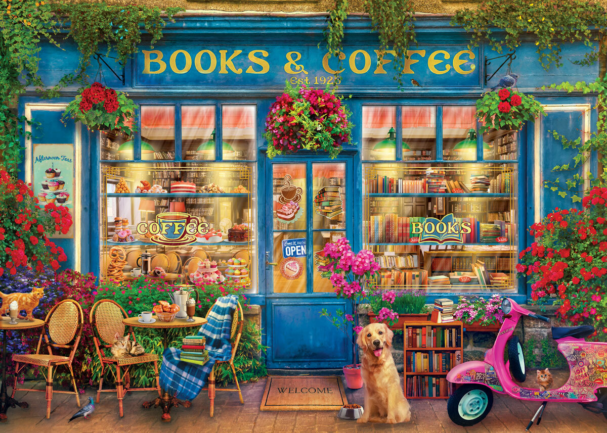 Eurographics 1000 Piece Puzzle: Books & Coffee. Escape to the cozy world of books and coffee with the Eurographics 1000 Piece Puzzle: Books & Coffee. This stunning puzzle features a detailed and atmospheric image of a bookstore café, complete with towering shelves of books, inviting tables, and delicious-looking coffee and pastries. As you piece together the puzzle, you'll be able to imagine yourself browsing the shelves for a new book to read, enjoying a cup of coffee with friends, or simply taking a moment to relax and unwind in this cozy atmosphere.