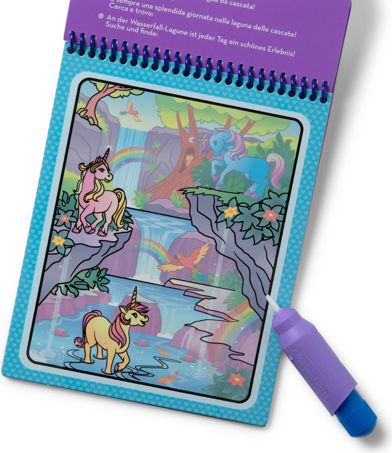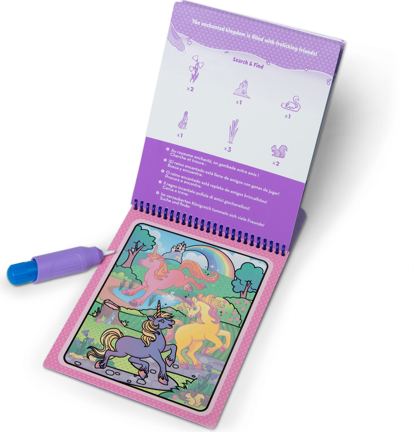 No-mess Water WOW! painting for kids! This exciting paint-with-water coloring book includes four reusable pages and a refillable water pen. Use the pen to color in each scene -- details, and vibrant colors appear with every stroke! Let the page dry to erase the pictures and color it in again and again. This unicorn-themed spiral-bound book includes four scenes to color, and search-and-find activities for each scene. The chunky-sized water pen is easy to hold and stores neatly right in the front cover, making this Water WOW! an ideal travel activity book and travel toy for kids!