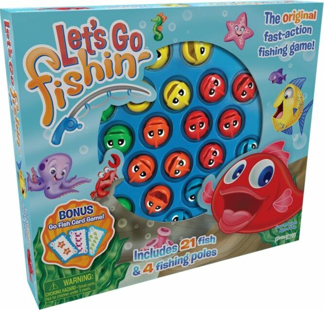 Let's Go Fishin' game teaches hand-eye coordination as players use their mini fishing poles to try to catch the most fish. With a rotating pond and hungry fish that open and close their mouths. With 21 fish and 4 fishing rods, this classic kids game provides fast-paced fishing fun that will lure kids into playing over and over again. This combo pack includes the classic children's card game Go Fish. Go Fish is a great introductory card game for preschoolers that teaches taking turns, identifying patterns, and strategy.